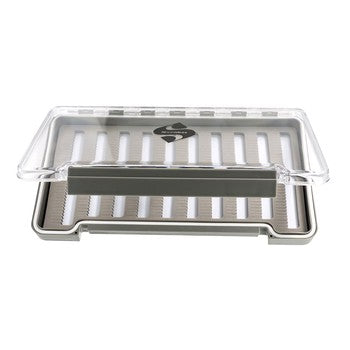 Available in two versions; the nymph and buzzer box is fitted with high density silicone foam, offering a firm grip on any size fly and with sufficient room to hold up to 192 flies. For hackled dry and wet flies, there is the traditional high-density slit-ethafoam lined model, with a white back-board for easy fly identification which will hold up to 306 flies.