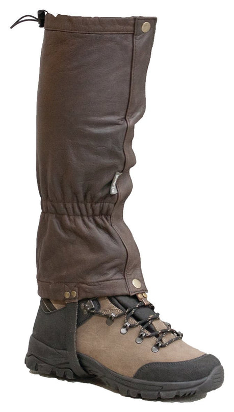 Keep your lower legs dry and comfortable without having to wear wellington boots. These brown leather gaiters are waterproof, feature a velcro and popper stud fastening with lace hook at the bottom and drawstring at the top. A rubber strap secures the gaiter under the sole of your footwear which is strong, durable with a grip pattern to keep the gaiters in place.