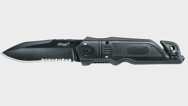 Walther Emergency Rescue Knives are carefully designed tools that can save lives. Their 440 stainless steel blades have a black coating and are serrated on the rear third for cutting cords and belts. The Walther ERK has a linerlock mechanism. Two very important features can be found in the rear third of the handle being; a belt cutter and glass breaker - indispensable in emergencies. In addition to a switchable belt clip, the Walther ERK comes with a rugged nylon holster.