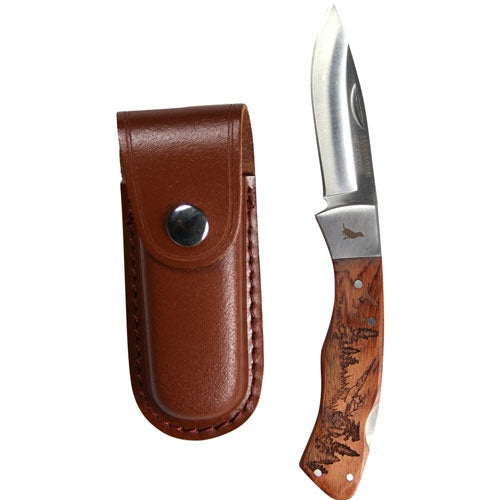 Jack Pyke 'Shires' Knife Range includes a 3" stainless steel blade knives with rosewood handles, featuring a laser-etched country scenes on the bolster. Range includes; hunter, fish, pheasant and deer.