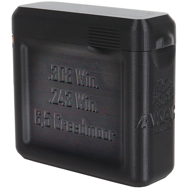 Plastic bullet box with neodymium magnet in the lid for easy and safe closure. A foam insert in the lid ensures good noise damping. The box is manufactured using the 3D printing process.